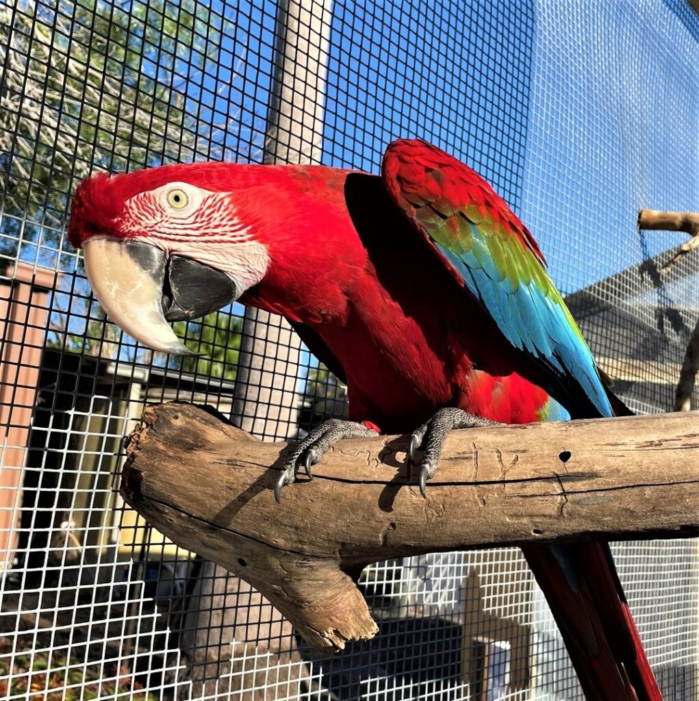 Exotic parrots in outdoor enclosures to engage with visitors.